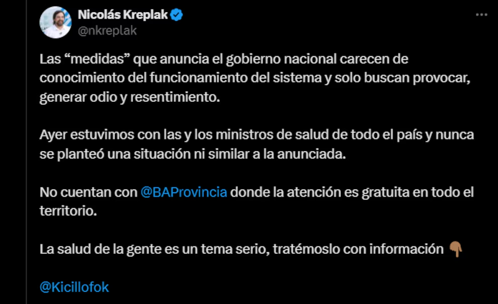 En un posteo de X, Kreplak aseguró que ayer mantuvieron una reunión todos los ministros de salud del país y que «nunca se planteó» una situación «ni similar a la anunciada».