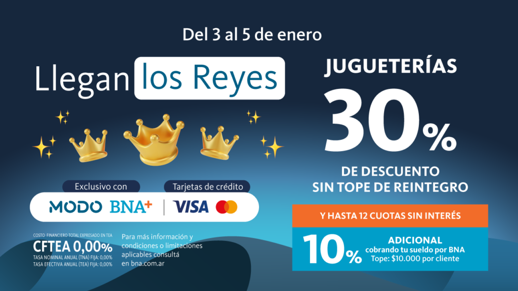 Desde el viernes 03 al domingo 05 de enero, la entidad ofrece un 30% de descuento sin tope de reintegro y 12 cuotas sin interés con MODO BNA+ y las tarjetas Visa y Mastercard en jugueterías adheridas.
