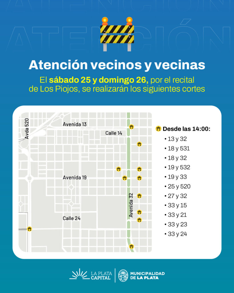 En ese marco, desde las 14:00 se mantendrán cerrados al tránsito los cruces de 25 y 520, 19 y 532, 19 y 33, 27 y 32, 33 y 15, 33 y 24, 33 y 23, 33 y 21, 13 y 32, 18 y 32, 18 y 531 y habrá controles en la bajada de la Autopista Buenos Aires – La Plata.