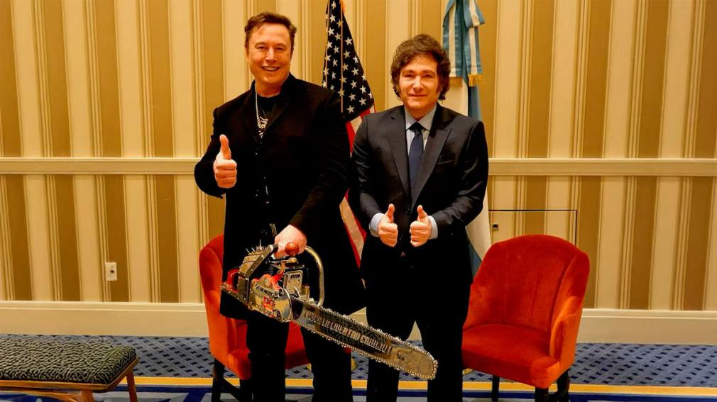 En su primera actividad oficial en Estados Unidos, Javier Milei se reunió con Elon Musk en un hotel cinco estrellas de Maryland para analizar el tablero internacional y las posibles inversiones americanas en la Argentina. El encuentro inició pasadas las 15.15 (hora del este). Casi cuatro horas después, la cuenta oficial de X Oficina del Presidente, difundió la imagen de los protagonistas del encuentro. En ella se puede ver al creador de Tesla con una motosierra real, regalo y símbolo de las políticas de reorganización del Estado del presidente argentino.