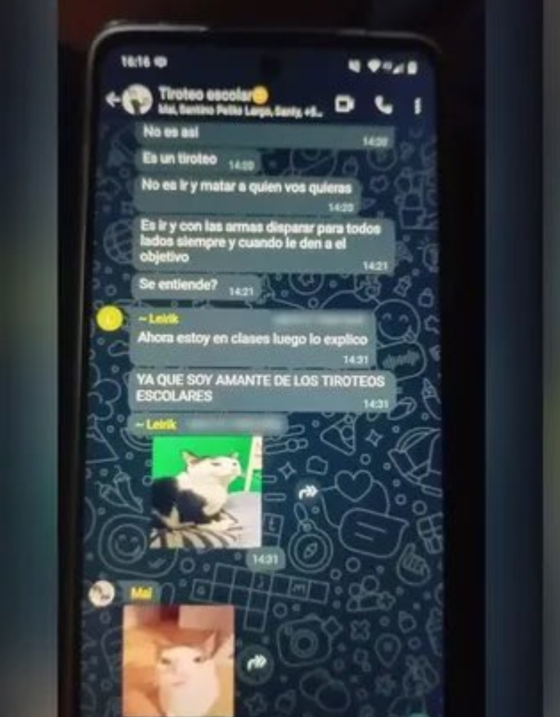 “Bien, la cosa es así. Vamos a entrar por la entrada principal, como siempre, y luego irán dos arriba y dos abajo. Acá no es que ustedes elijan a quién m…. le van a disparar. Persona que ven, persona a la que le disparan”, escribió una alumna identificada como “Mai” en un grupo privado llamado “Tiroteo escolar”.
