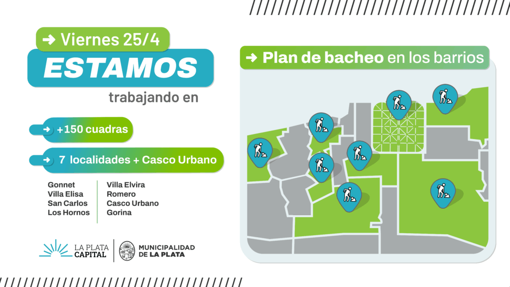La Municipalidad informa que durante la jornada de este viernes 25 de abril se realizarán trabajos de bacheo en más de 150 cuadras de Villa Elisa, Gonnet, Gorina, San Carlos, Melchor Romero, Los Hornos, Villa Elvira y el casco urbano, con cortes parciales y momentáneos en las calles intervenidas.