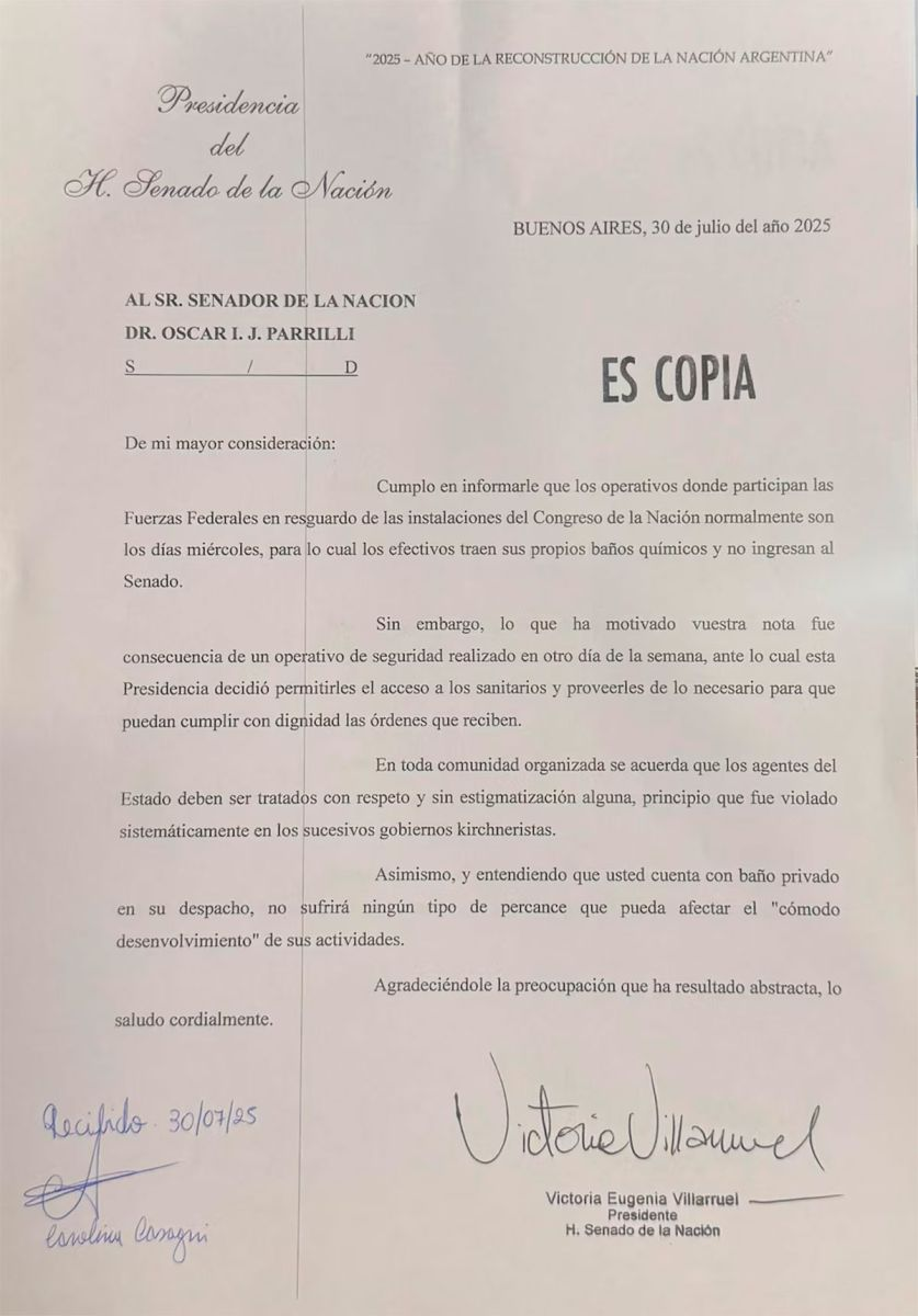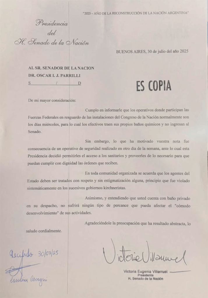 Frente a ese reclamo, la titular del Senado reaccionó con firmeza y lo calificó de “insólito”. En su respuesta, Villarruel defendió el derecho de los servidores públicos a ser tratados con respeto y señaló que impedirles el uso de sanitarios representa una actitud discriminatoria, contraria al ideal de una comunidad organizada.