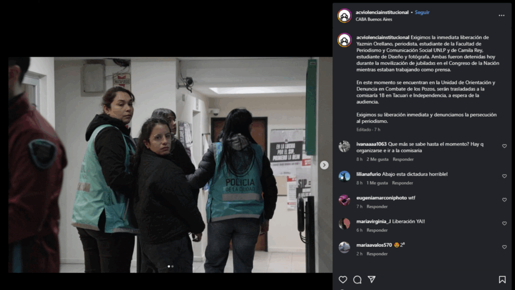En imágenes difundidas por la organización se puede ver a Orellano y Rey dentro de una dependencia policial, bajo la custodia de efectivos porteños, lo que alimentó el reclamo y la indignación en redes sociales y entre colegas de prensa.