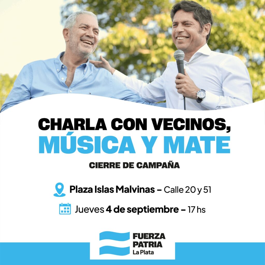 Este jueves 4 de septiembre a las 17:00, la Plaza Islas Malvinas de 20 y 51 será el epicentro del cierre de campaña de Fuerza Patria en La Plata, en el marco de una jornada que contará con música en vivo, mateada y charla con vecinos.