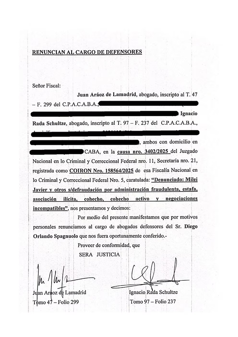 Los letrados Juan Aráoz de Lamadrid e Ignacio Rada Schultze presentaron su dimisión ante el juez federal Sebastián Casanello, alegando “motivos personales”. La decisión se produjo en medio de las definiciones judiciales sobre la validez de las pruebas y los próximos pasos del expediente.