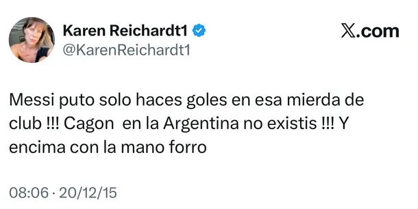 En el tuit, publicado el 20 de diciembre de 2015, día en que Barcelona derrotó a River en la final del Mundial de Clubes, Reichardt escribió de manera despectiva: