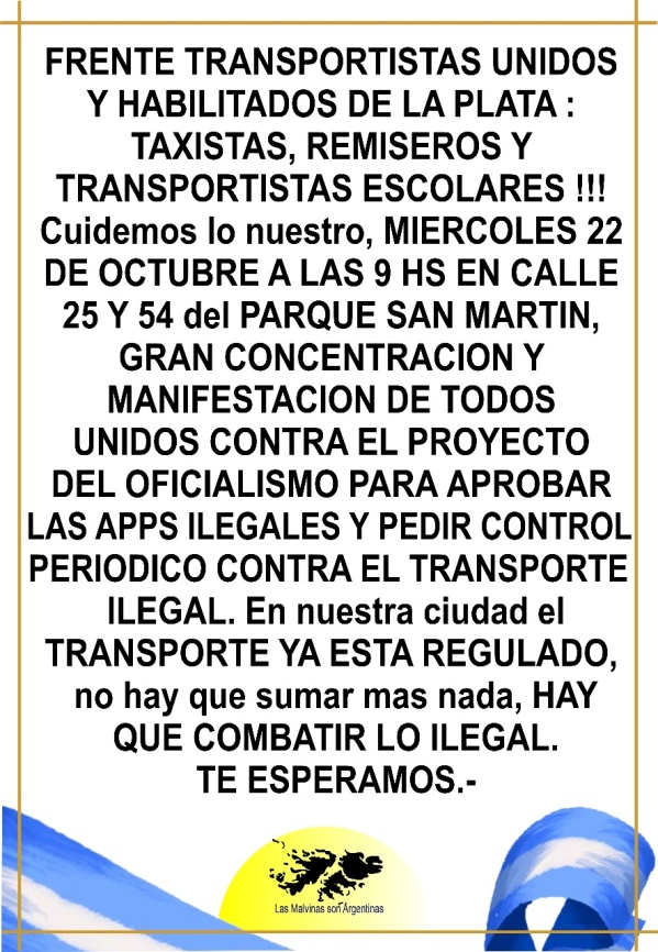 “Cuidemos lo nuestro. En La Plata el transporte está regulado, no hay que sumar más nada, hay que combatir lo ilegal”, expresaron los organizadores en un comunicado difundido por redes sociales.