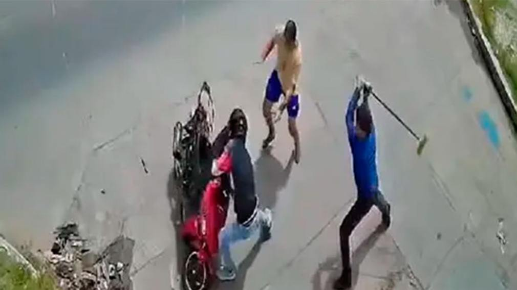 Los gritos de la víctima alertaron a los vecinos, que salieron de sus viviendas ante la demora de la llegada policial. En las imágenes se ve cómo algunos residentes enfrentaron a los asaltantes con objetos domésticos: uno de ellos golpeó a uno de los motochorros con un secador de piso, mientras otro intentó reducir al segundo con una escoba.