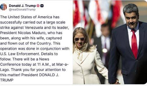 “Los Estados Unidos de América han llevado a cabo con éxito un ataque a gran escala contra Venezuela y su líder, el presidente Nicolás Maduro, quien ha sido capturado junto con su esposa y trasladado fuera del país.