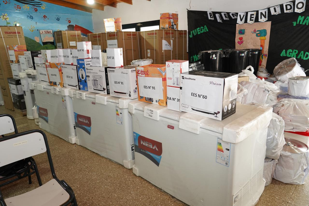 Entre los elementos entregados se incluyeron cocinas, procesadoras, heladeras, freezers, un termotanque, un horno pizzero, vajilla, balanzas, batidoras, licuadoras y mixers con el objetivo de fortalecer la infraestructura de los comedores y mejorar las condiciones en las que se elaboran y sirven los alimentos.