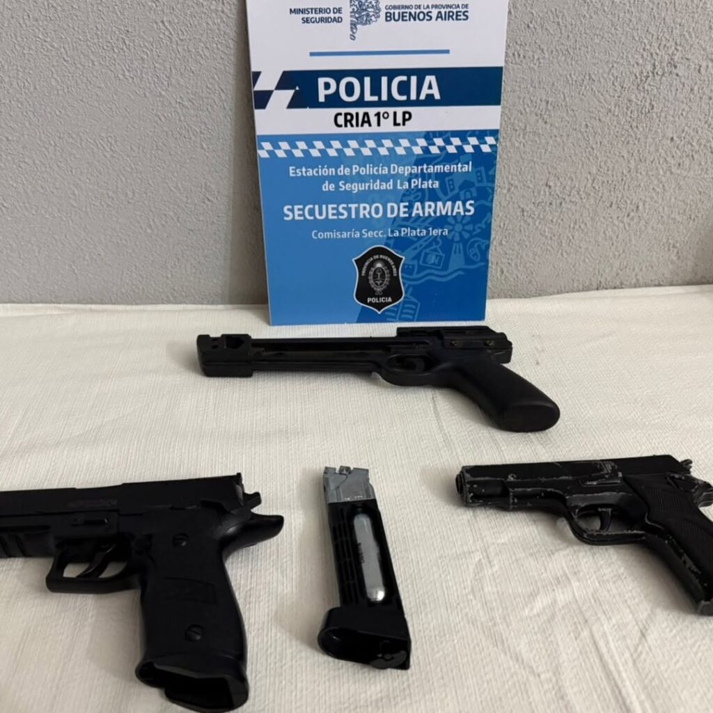 Durante el operativo, el personal policial secuestró dos réplicas de armas de fuego y una pistola de aire comprimido, elementos que quedaron a disposición de la Justicia para ser peritados.