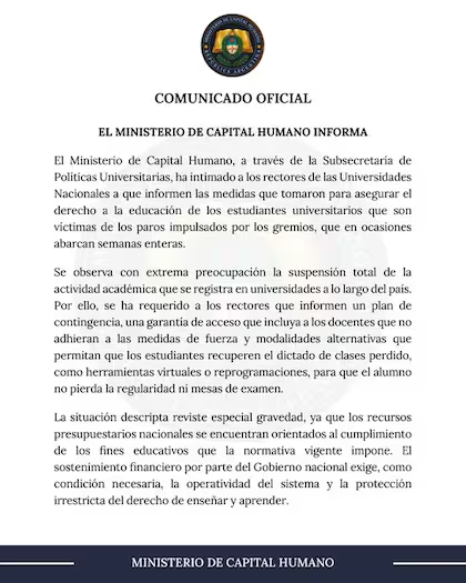 El pedido fue realizado por el Ministerio de Capital Humano, a través de la Subsecretaría de Políticas Universitarias, que expresó su “extrema preocupación” por la suspensión total de la actividad académica en algunos casos durante semanas enteras. En ese marco, exigieron la elaboración de un plan de contingencia que permita garantizar el derecho a la educación de los estudiantes.
