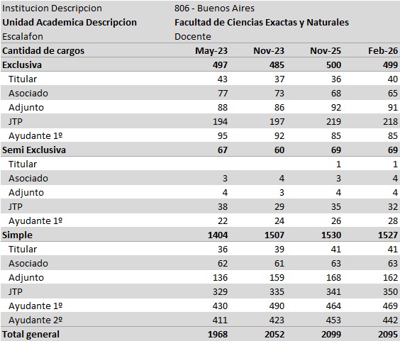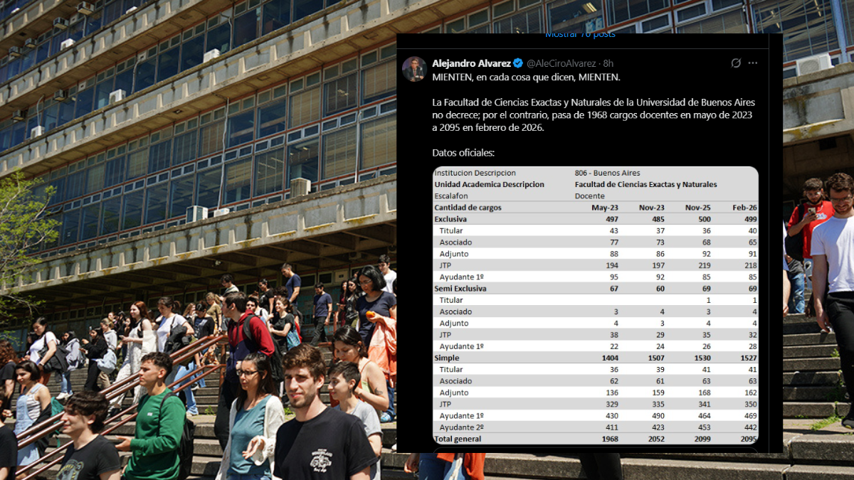 A través de sus redes sociales, el funcionario afirmó que “mienten en cada cosa que dicen” y puso como ejemplo el caso de la Facultad de Ciencias Exactas y Naturales de la UBA. Según los números difundidos, esa unidad académica pasó de 1.968 cargos docentes en mayo de 2023 a 2.095 en febrero de 2026, lo que implicaría un incremento en la planta.
