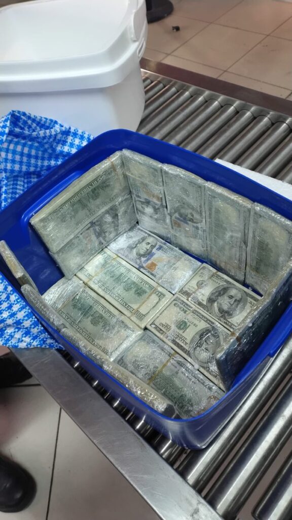 Fue entonces cuando, a través de un escáner de rayos X, descubrieron que en una conservadora portátil transportaba una importante suma de dinero en efectivo. Los billetes estaban distribuidos en fajos y escondidos entre botellas de gaseosa y agua, en un intento de pasar desapercibidos.